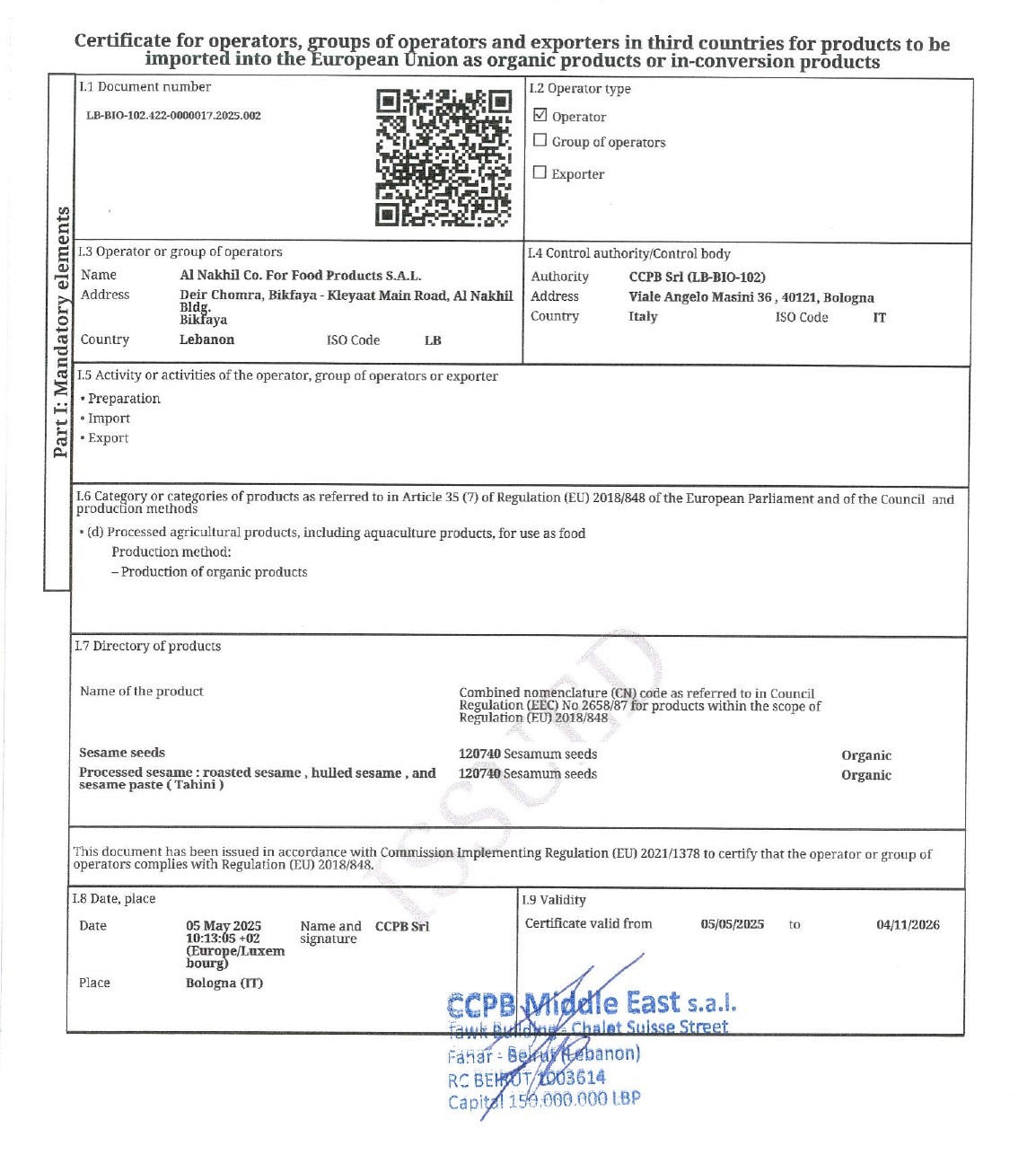 This document proves that our company is certified organic under the U.S. National Organic Program and is authorized to produce organic tahina and sell it in the countries that follow the U.S. standards. Our certificate is also in accordance with the Canadian Organic Regime (COR), which allows us to sell organic tahina in Canada.